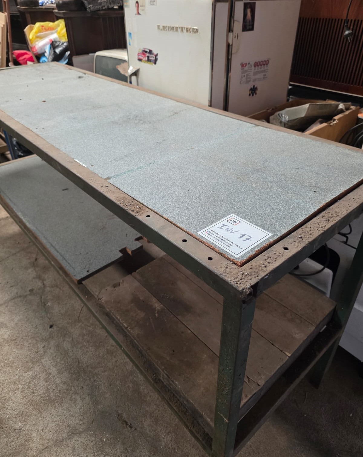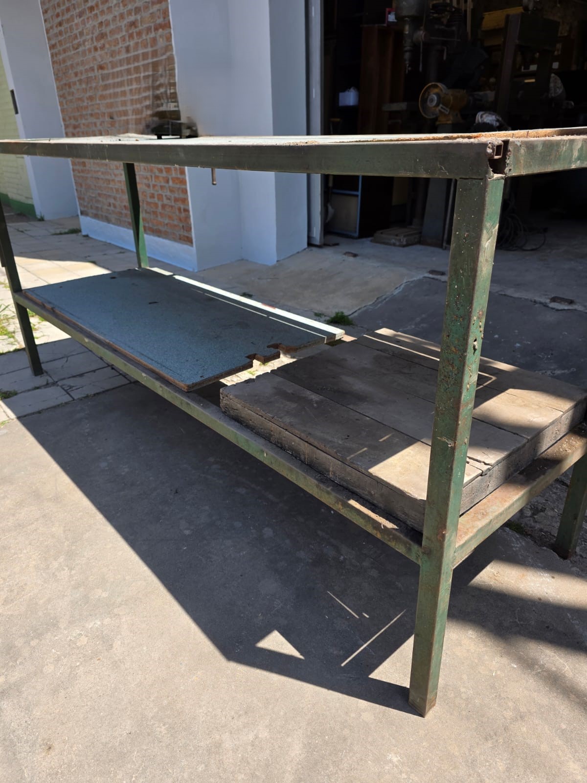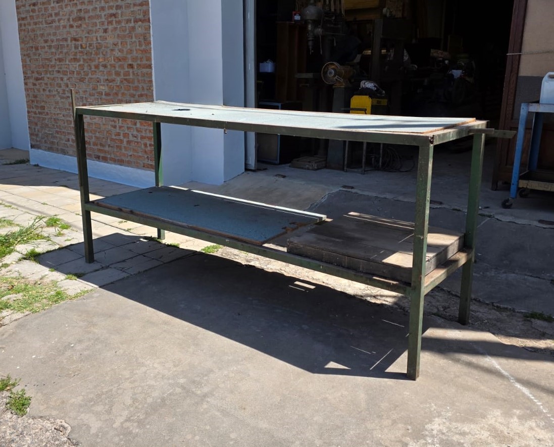 Banco de trabajo de caño cuadrado, con tapas de aglomerado, medidas 2,25 mts de ancho x 0,70 mts de profundidad x 1 mts de alto, con una base abajo. Usado en el estado en que se encuentra.