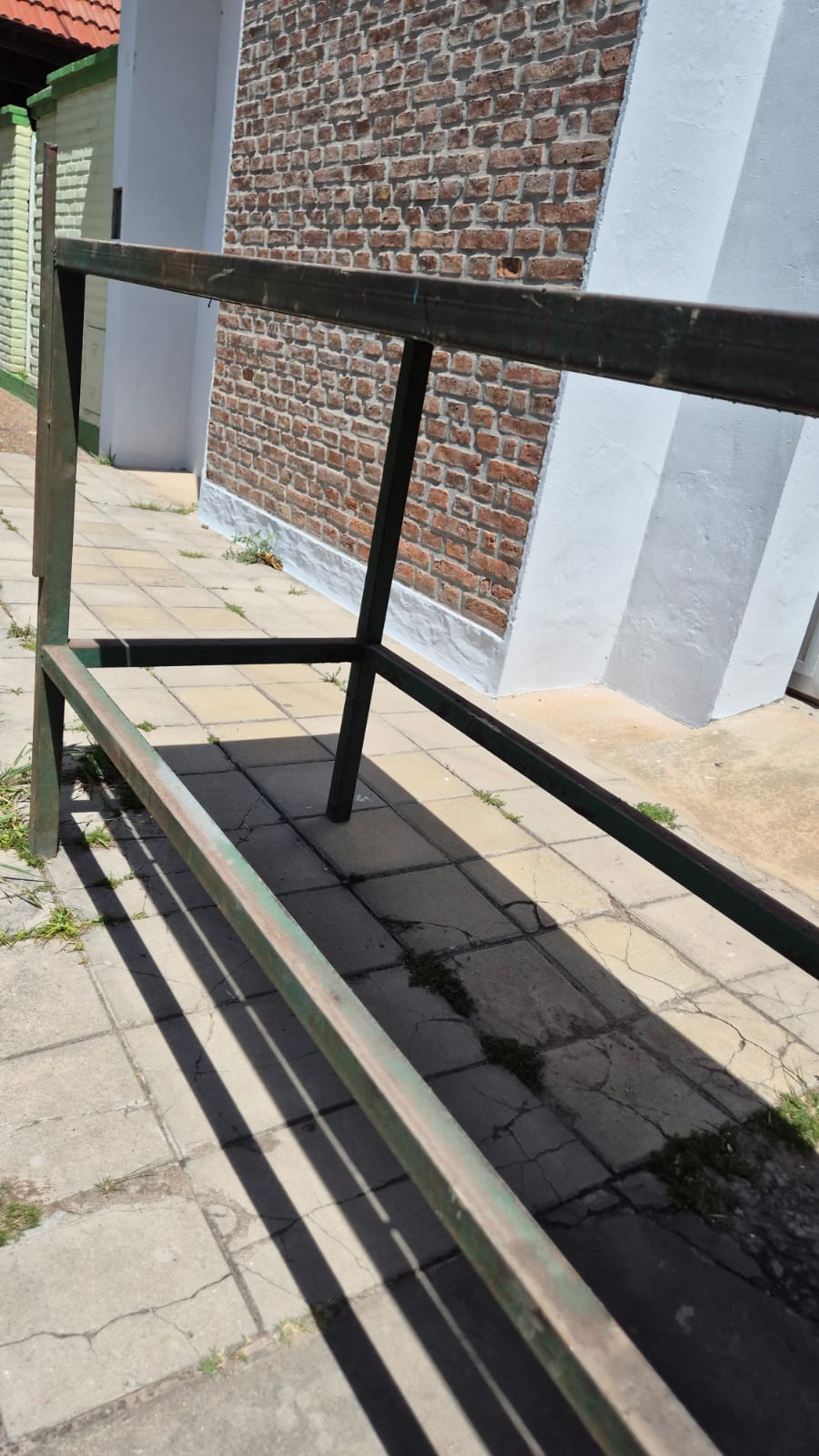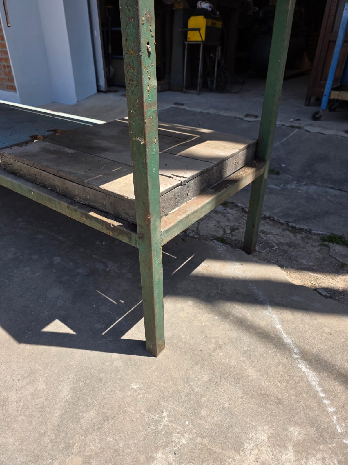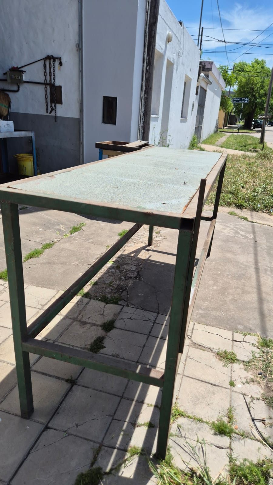 Banco de trabajo de caño cuadrado, con tapas de aglomerado, medidas 2,25 mts de ancho x 0,70 mts de profundidad x 1 mts de alto, con una base abajo. Usado en el estado en que se encuentra.