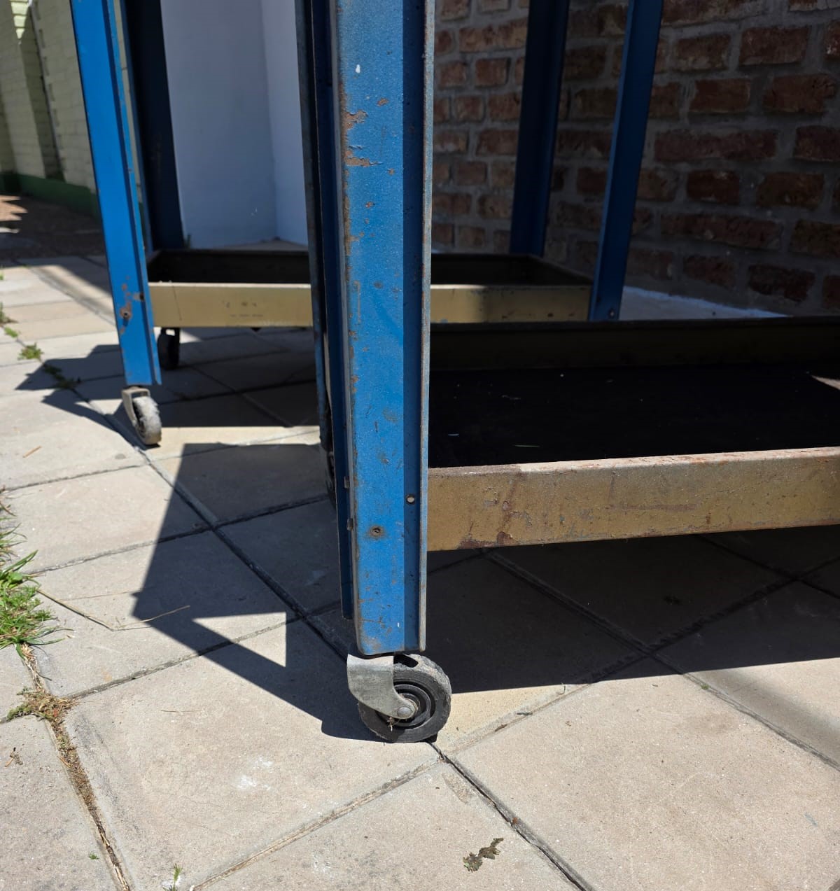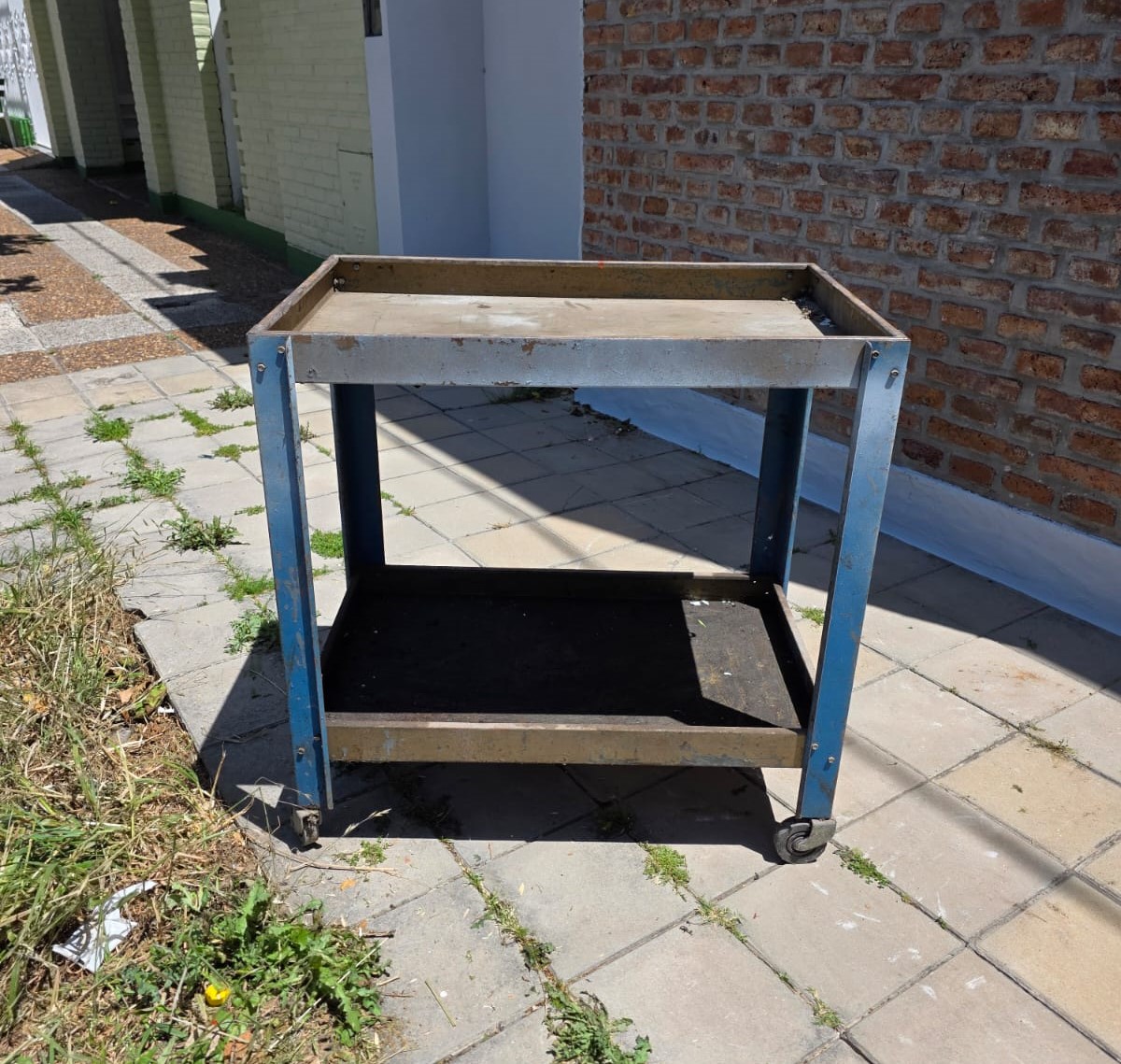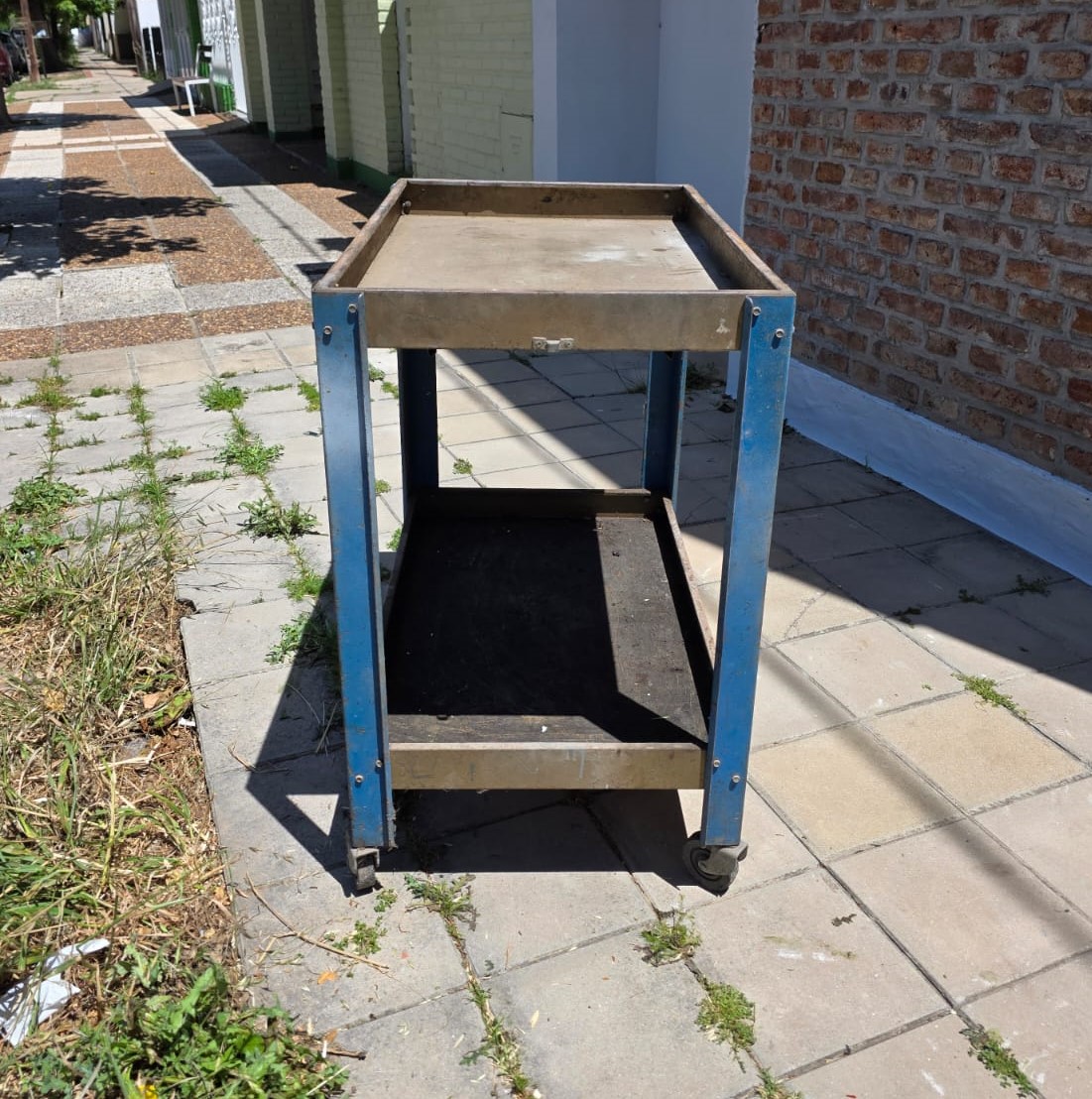 Carrito porta herramientas de dos bandejas sin cajoncito, con 4 ruedas. Medidas 0.80 mts de ancho x 0.50 mts de profundidad x 0.82 mts de alto. Usado en el estado en que se encuentra.