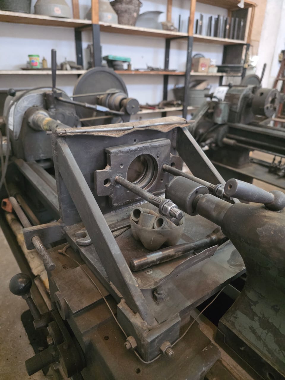 Torno marca "Cemorca", adaptado para alesar, con accesorios para volverlo a torno convencional. Tiene charriot y carro transversal, plato de 4 mordazas, plato de 3 mordazas, luneta fija y luneta móvil, con distancia entre puntas de 800mm. Usado en el estado en que se encuentra.