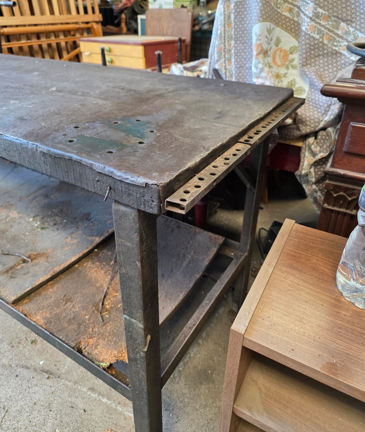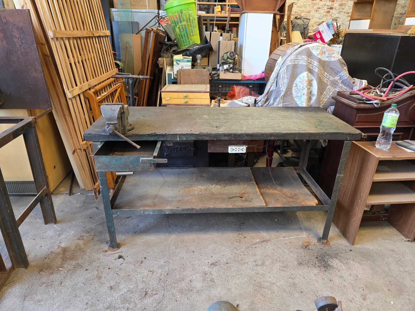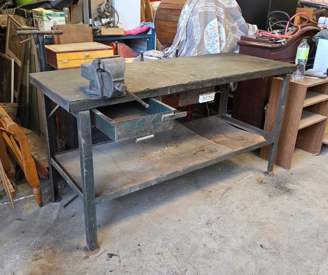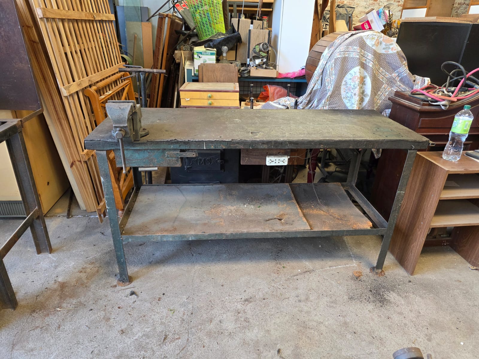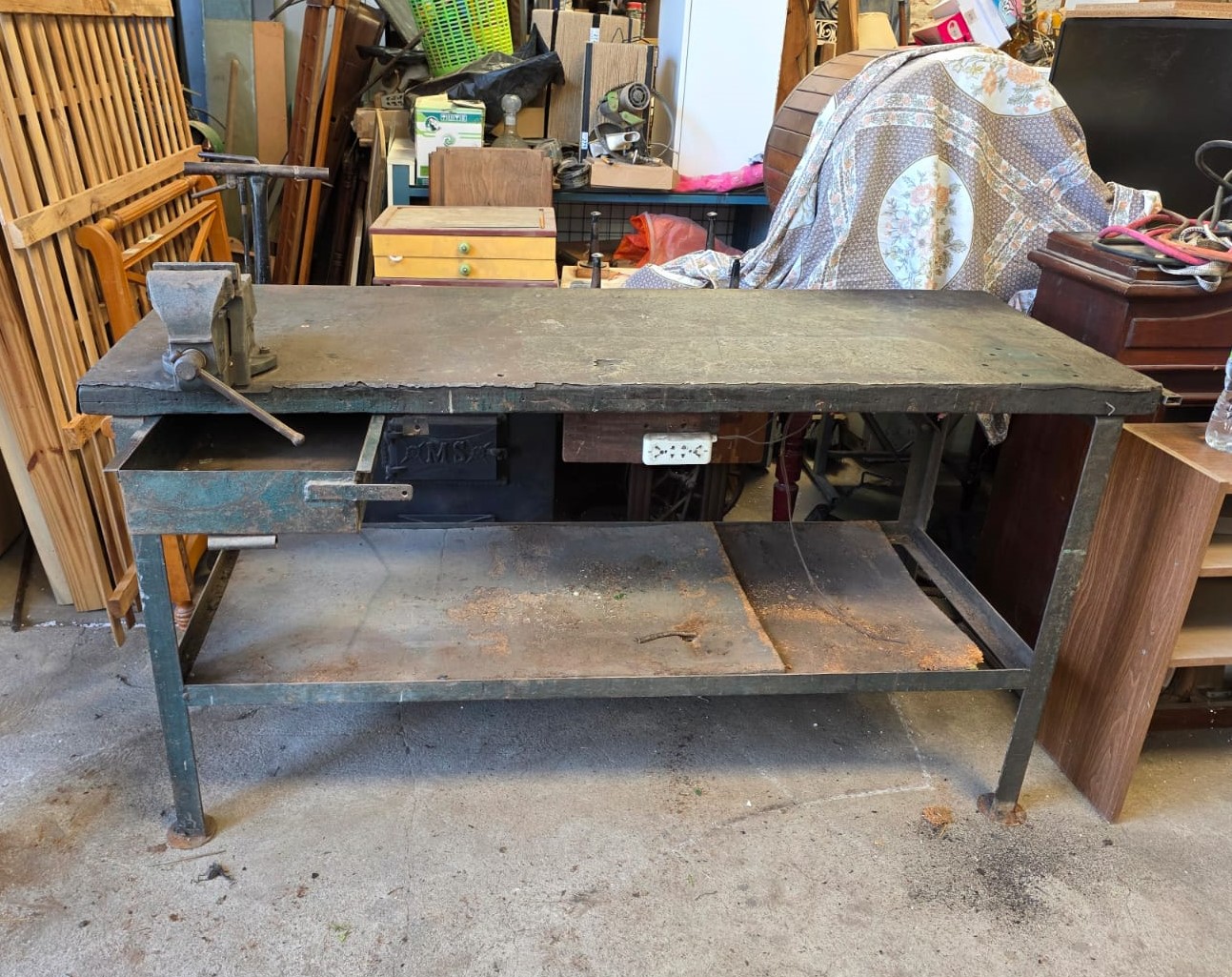 Banco de trabajo de hierro ángulo, con tapa de madera de 2 pulgadas de espesor con chapa arriba, tiene un cajón. Medidas del banco 1.76 mts de ancho x 0.64 mts de profundidad x 0.92 metros de alto. Usado en el estado en que se encuentra.