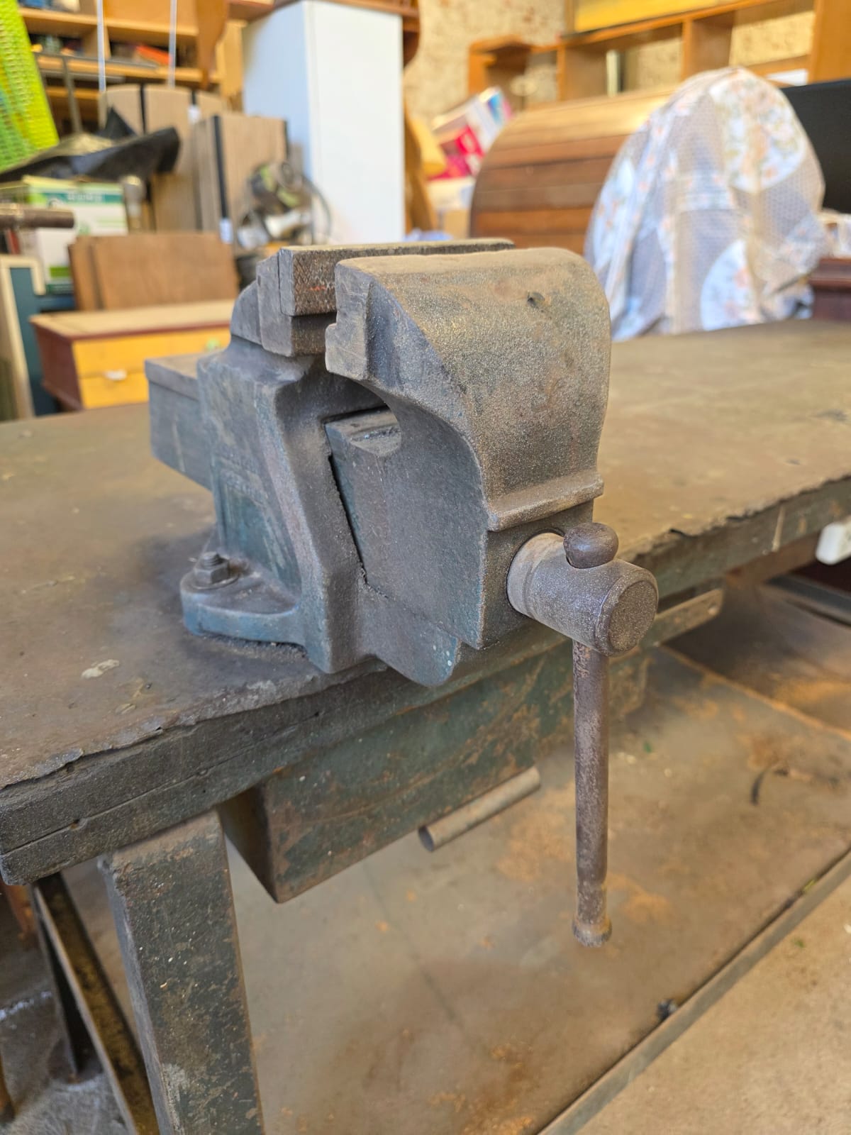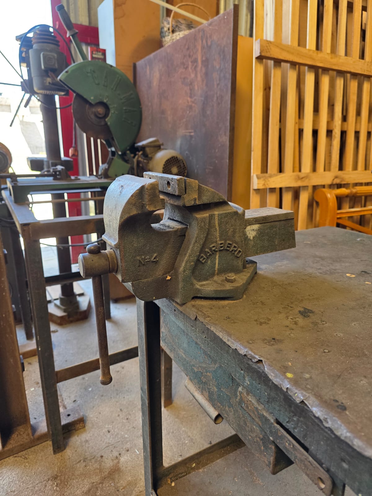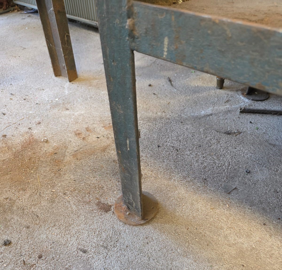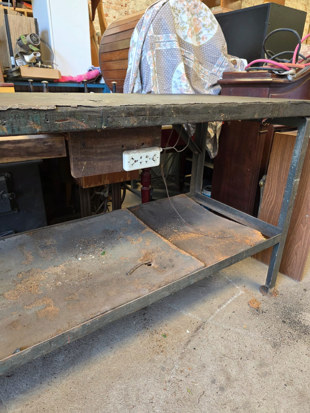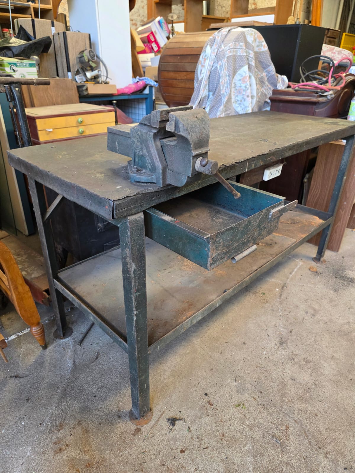 Banco de trabajo de hierro ángulo, con tapa de madera de 2 pulgadas de espesor con chapa arriba, tiene un cajón. Medidas del banco 1.76 mts de ancho x 0.64 mts de profundidad x 0.92 metros de alto. Usado en el estado en que se encuentra.