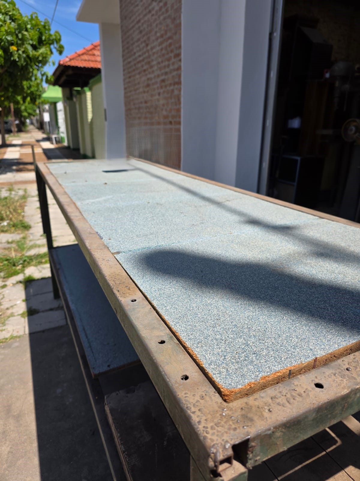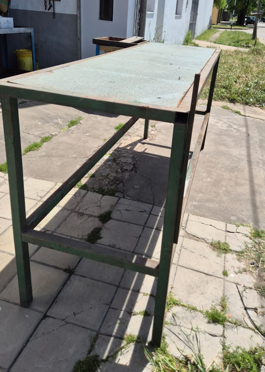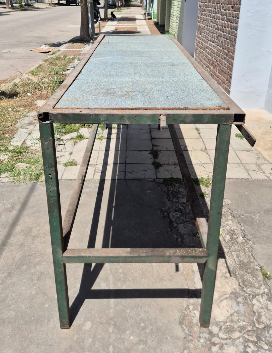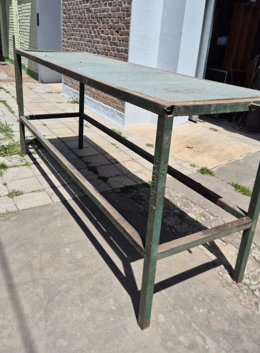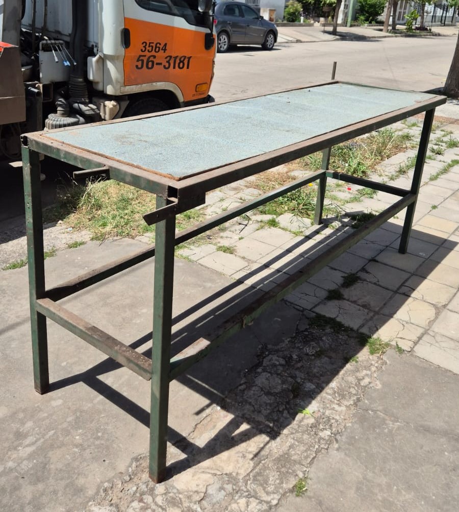Banco de trabajo de caño cuadrado, con tapas de aglomerado, medidas 2,25 mts de ancho x 0,70 mts de profundidad x 1 mts de alto, con una base abajo. Usado en el estado en que se encuentra.