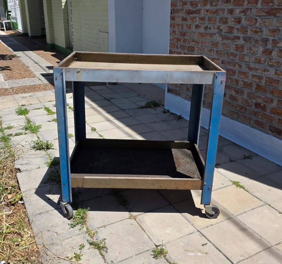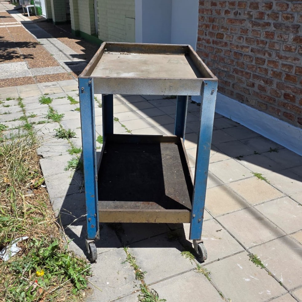 Carrito porta herramientas de dos bandejas sin cajoncito, con 4 ruedas. Medidas 0.80 mts de ancho x 0.50 mts de profundidad x 0.82 mts de alto. Usado en el estado en que se encuentra.